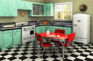 Έρχονται συσκευές και έπιπλα όπως φρυγανιέρες, ψυγεία και τραπέζια κουζίνας, όλα με στρογγυλεμένες άκρες. Κυρίαρχος και ο κλασικός πλέον συνδυασμός από μαύρα-άσπρα πλακάκια!