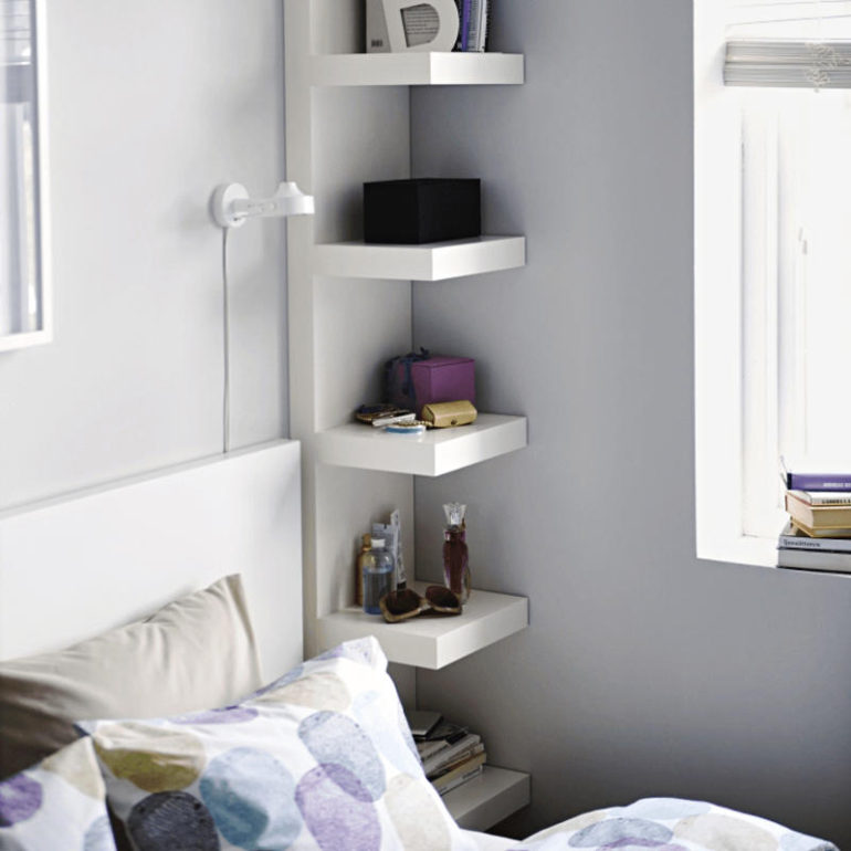 Εδώ το κομοδίνο αντικαταστάθηκε με μια ψηλή και στενή βιβλιοθήκη, με πολύ αποθηκευτικό χώρο καταλαμβάνοντας λίγο περισσότερο χώρο από το κομοδίνο. Τα δύο πιο κοντινά στο κρεβάτι ράφια, μπορείς να τα χρησιμοποιήσεις ως το κομοδίνο που αντικατέστησες για την λάμπα, το νερό και τα αγαπημένα σου βιβλία!