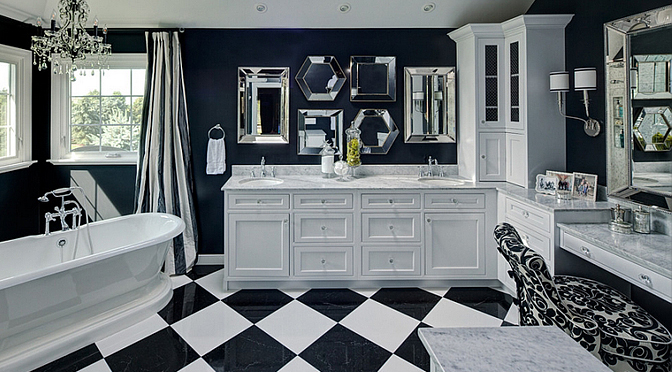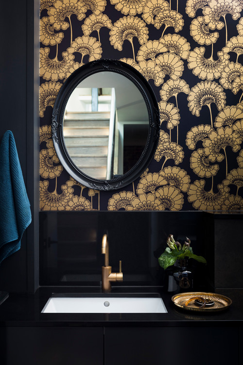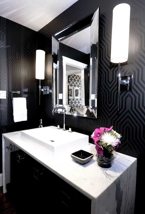 Παρόλα αυτά, αυτό δεν σημαίνει ότι η χρήση του μαύρου ως κυρίαρχου χρώματος στο μπάνιο είναι εύκολη. Θα πρέπει να γνωρίζετε πώς και πότε να το χρησιμοποιήσετε. Μην περιορίζεστε αποκλειστικά και μόνο στην χρήση του μαύρου. Υπάρχουν πολλές και όμορφες ταπετσαρίες με ασπρόμαυρα μοτίβα, κορνίζες με έντονα χρώματα, αντικείμενα με χρυσές η χάλκινες λεπτομέρειες που θα σπάσουν την μονοτονία.