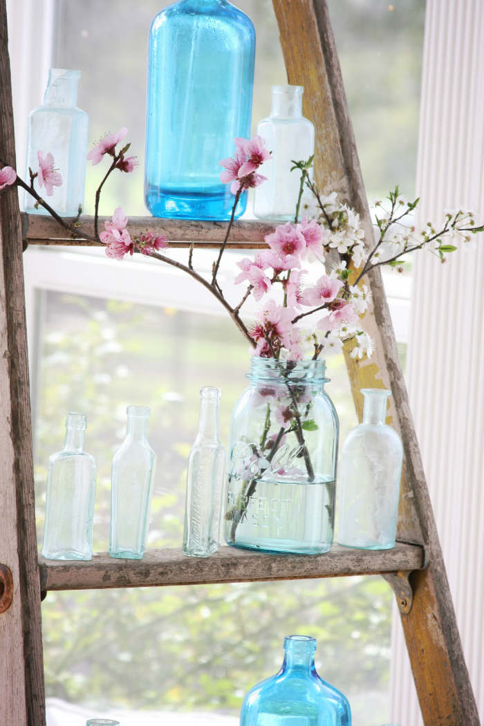 Περίπου απλά τα πράγματα. Παλιά σκάλα με εμφανή μικροχτυπήματα, λίγο γυαλοχαρτάρισμα και τεχνοτροπία distressed. Τα άνθη κερασιάς είναι πάντα όμορφα και έχουμε αντίστοιχα στην Ελλάδα (κουτσουπιές στα πεδινά και κερασιές στα ορεινά), ενώ τα μπλε μπουκάλια δίνουν χρώμα στο σύνολο. Απίστευτα έξυπνο: στερέωσε τα μπουκάλια με λίγη κόλλα!