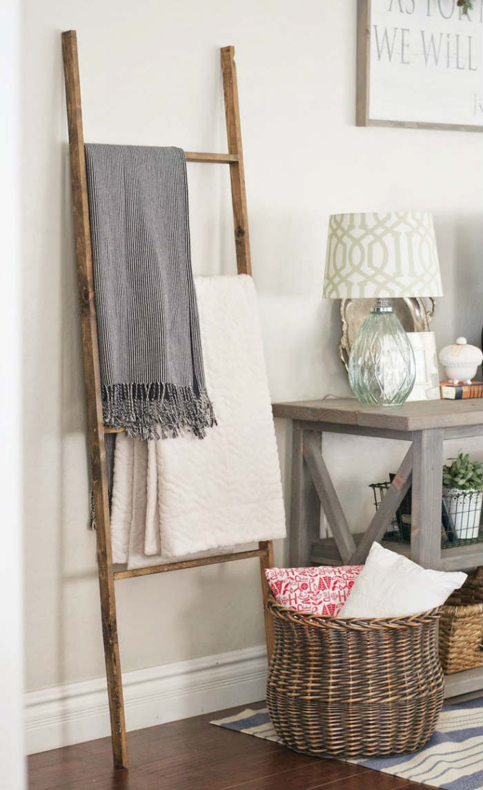 Μια απλή σκάλα που κατασκευάστηκε από 4 παλιά ξύλα. Τα 2 από αυτά χρησιμοποιήθηκαν για τα σκαλοπάτια. Πλέον χρησιμεύει για να κρεμιούνται οι κουβέρτες στο σαλόνι.