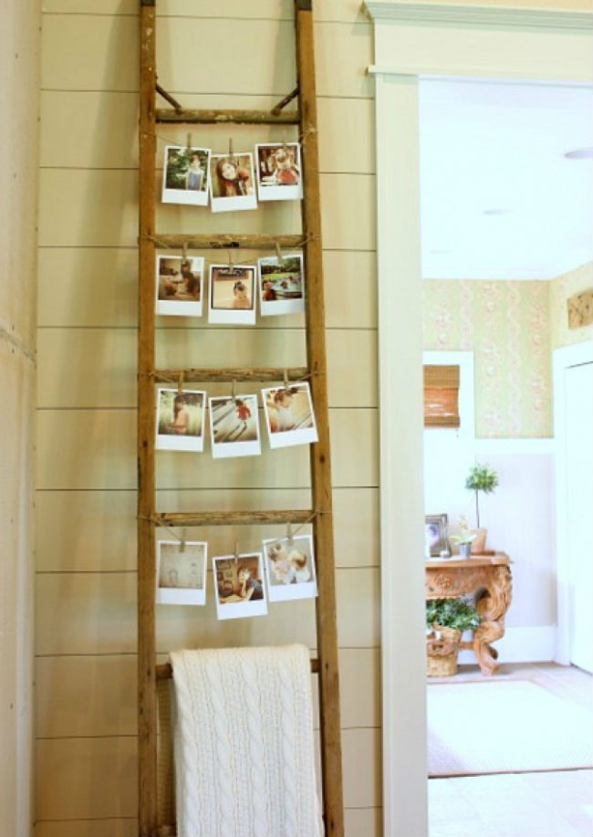 Σκάλα με τεχνοτροπία distressed για shabby chic αποτέλεσμα (η λευκή μπογιά βλέπεις). Κρεμάστηκαν φαναράκια, ένα φυτό, μια πετσέτα, ένα ανοιξιάτικο στεφάνι και ένα πινακιδάκι που γράφει «σπίτι είναι εκεί που βρίσκεται η καρδιά σου». Πηγαίνοντας ένα βήμα παραπέρα, η σκάλα κρεμάστηκε ανάποδα με επιτυχία.