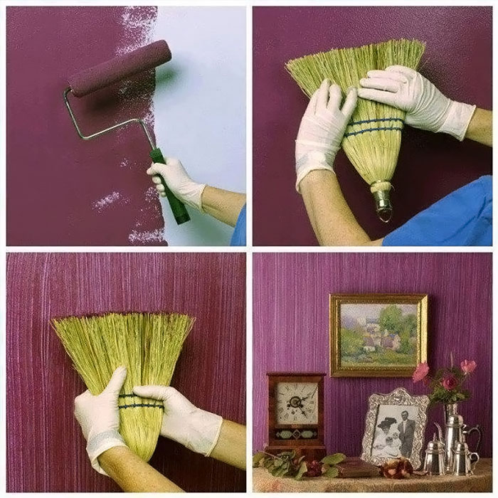 Αυτή η τεχνική είναι εύκολη και όμορφη. Όπως όλοι γνωρίζουμε οι κάθετες ρίγες είναι υπέρκομψες και η τελική υφή θυμίζει ύφασμα. Αφού βάψεις τον τοίχο με μπογιά (ή και βερνίκιglaze), πάρε την βούρτσα ή την ψάθινη σκούπα(!) και βούρτσισε κάθετα από πάνω προς τα κάτω. Αν δε κάνεις και οριζόντιες γραμμές το αποτέλεσμα θα θυμίσει λινό! Εκπληκτικό αποτέλεσμα σε γκρι-μπλε, καφέ, γκρι-πράσινο και βεραμάν.
