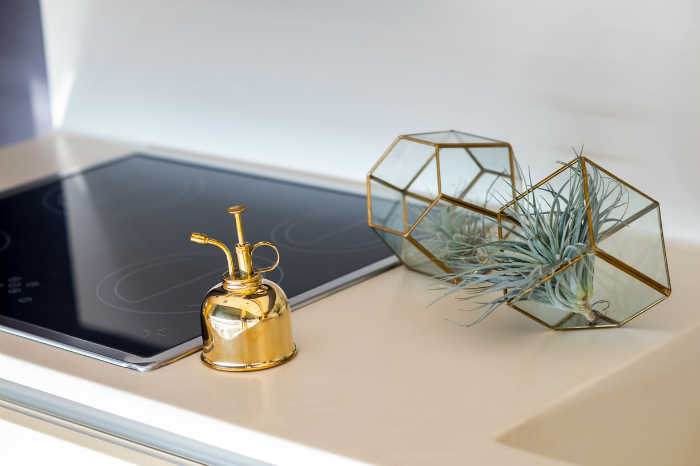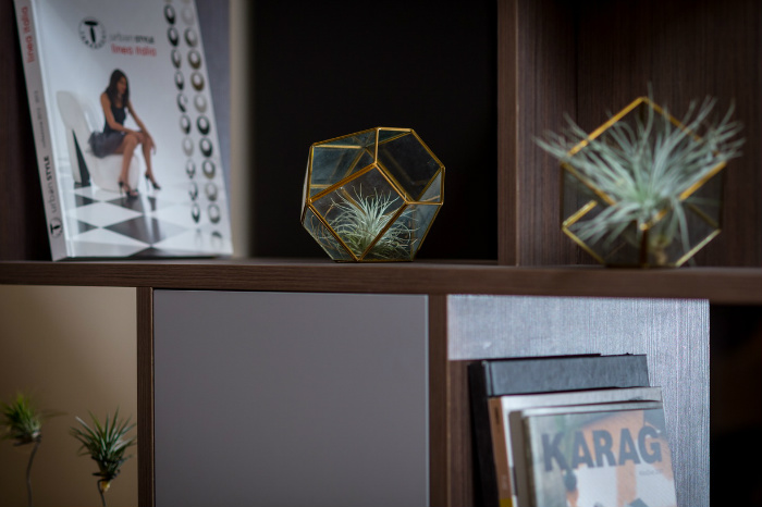 *Terrarium ή στα ελληνικά Κήπος κάτω από γυαλί (γελάει και ο Μπαμπινιώτης), είναι το αντίστοιχο της γυάλας, όπου συνήθως τοποθετούμε χώμα και δημιουργούμε ένα αυτόνομο κήπο με το δικό του μικροκλίμα. Ως καταλληλότερο για διακόσμηση εμείς προτείνουμε πολυγωνικό terrarium με χρυσό, μαύρο ή ανθρακί σκελετό. Σε αυτό μπορείς πάλι να τοποθετήσεις άμμο, βελούδο ή τσόχα που θα κάνει μαγευτικό συνδυασμό με το χρυσό του σκελετού και το πράσινο του φυτού.