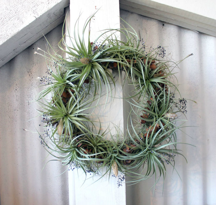 Ο πιο DIY καλλιτεχνικά όμορφος τρόπος για διακόσμηση με αερόφυτα. Ουσιαστικά πρόκειται για «ζωντανό» στεφάνι καθώς εκτός από τα αερόφυτα, μπορείς να κρεμάσεις βρύα, κουκουνάρια ή οτιδήποτε άλλο μπορεί να επιβιώσει εκτός χώματος ή αντέχει.