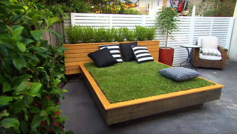 Βάθρο με γκαζόν εν ολίγοις όπως μπορείς να δεις κι εσύ από τις εικόνες, ή για να το εξευγενίσουμε, ας το βαφτίσουμε grass daybed. Η δουλειά θέλει μια κάποια ικανότητα στα ξυλουργικά και από εκεί και πέρα, απλές γνώσεις κηπουρικής Αν δεν το κατέχεις το άθλημα, μπορείς πολύ απλά να επενδύσεις με ψεύτικο γκαζόν που θα βρεις πλέον σε καταπληκτική ποιότητα, που δεν το ξεχωρίζεις από το αληθινό.