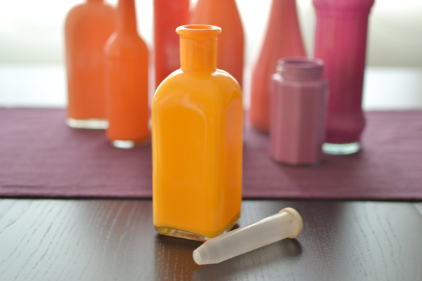 Στη συνέχεια ρίχνουμε όλο το χρώμα στο μπουκάλι με τη βοήθεια της σύριγγας. Τα μεγαλύτερα μπουκάλια θα χρειαστούν μεταξύ 80 και 100 ml ώστε η μπογιά να τα καλύψει άνετα.
