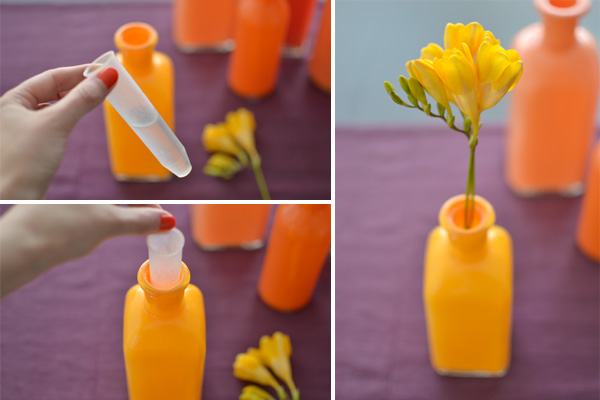 Αν χρησιμοποιήσετε τέμπερες νερού, δεν θα μπορείτε να γεμίσετε τα μπουκάλια με νερό, γιατί το χρώμα είναι υδατοδιαλυτο. Είναι απαραίτητη η χρήση μικρών πλαστικών σωλήνων (μπορείτε να τους βρείτε σε ανθοπωλεία) ώστε να τους γεμίσετε νερό και έπειτα να τοποθετήσετε λουλούδια!