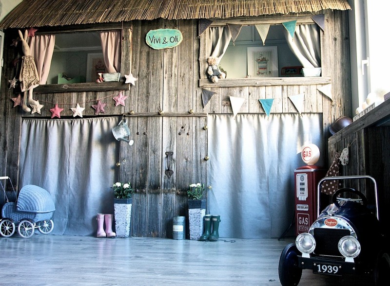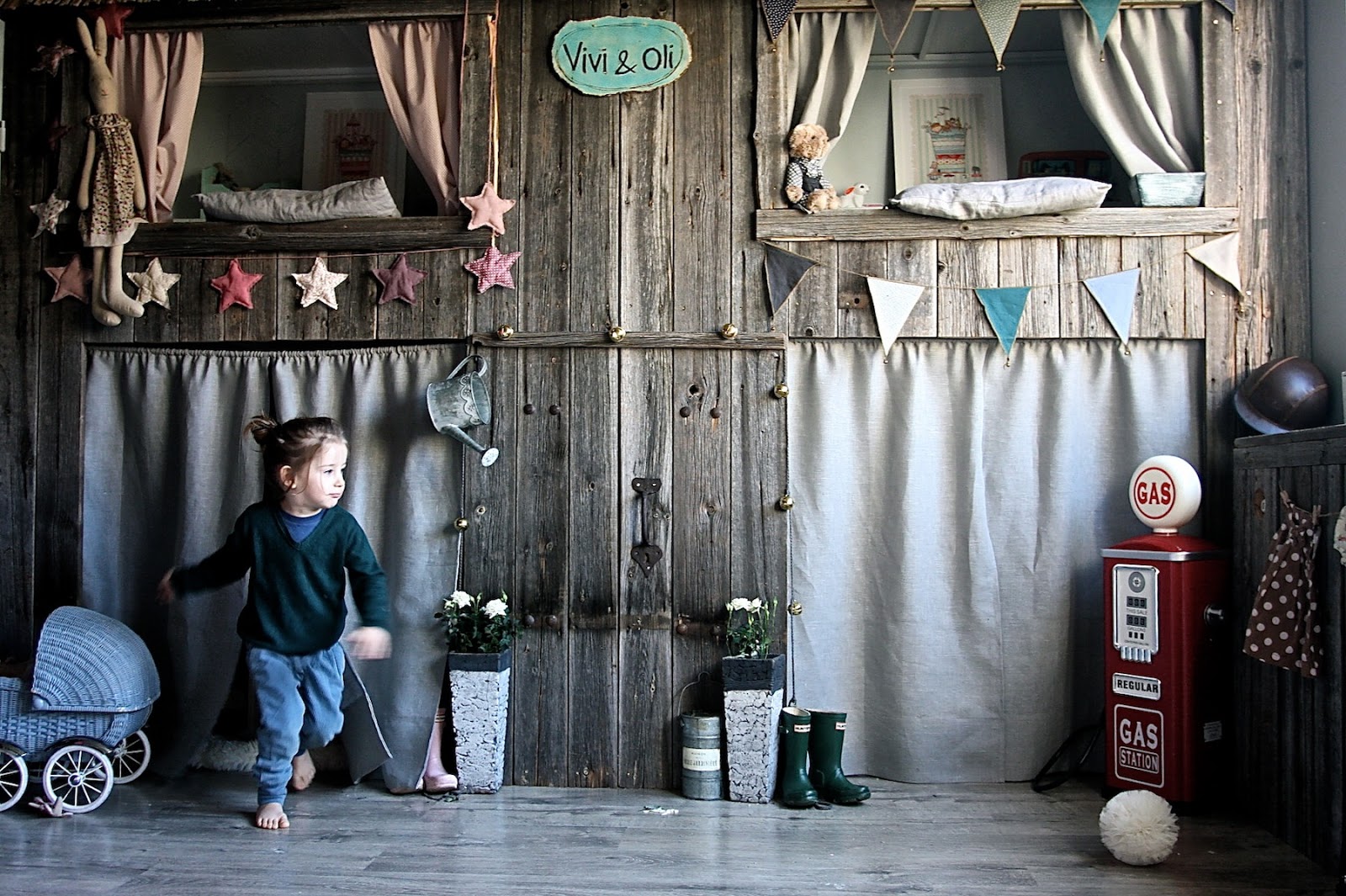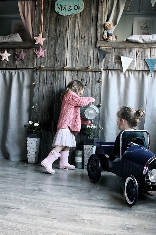 Τα κρεβάτια της ΙΚΕΑ, επενδύθηκαν με παλιά καδρόνια και το αποτέλεσμα, μιμούμενο μια καλύβα είναι μαγικό! Άπλετος αποθηκευτικός χώρος από κάτω, κρυμμένος με κουρτίνες και πάνω ανοίγματα υπό τη μορφή παραθύρων. Σκεπή από καλάμια για ένα αληθοφανές αποτέλεσμα και δεν ξεχνάμε τις γλάστρες που σηματοδοτούν την είσοδο,φυσικά. Και η υπόλοιπη διακόσμηση, ακόμη και τα παιχνίδια τους, είναι όμως τόσο ιδιαίτερα.