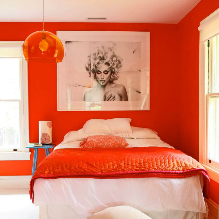 Εδώ λοιπόν όπου βλέπετε την κεντρική μας φωτογραφία ολόκληρη, το κόκκινο-πορτοκαλί δεσπόζει στον χώρο. Στυλιστικά είναι εξαιρετικό χωρίς την γνώση του πόσο επηρεάζει την ξεκούραση ένα τόσο έντονο χρώμα (λογικά πολύ). Το δωμάτιο δέθηκε με λευκό και οι λεπτομέρειες του φωτιστικού και της ασπρόμαυρης φωτογραφίας της Μαντόνα εντυπωσιάζουν.