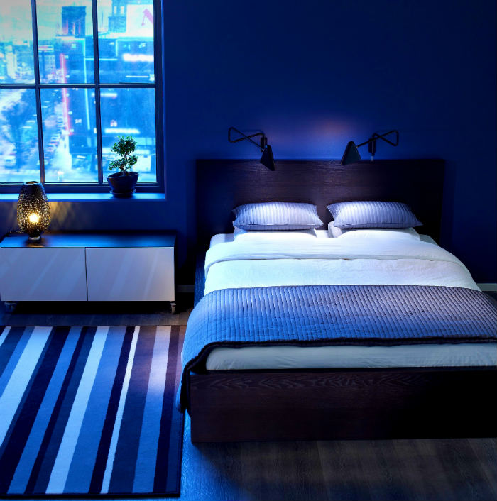 Επιτέλους μινιμαλισμός! Απλά τα πράγματα με πολλές αποχρώσεις του μπλε στο δωμάτιο και το κοβάλτιο στον τοίχο. Κάθε πηγή φωτός χαρίζει και άλλη απόχρωση και αυτή η ατμόσφαιρα σίγουρα σε ξεκουράζει. Έχει πολλά στοιχεία μονοχρωματικής διακόσμησης, φυσικά λευκό και δύο διαφορετικές αποχρώσεις του ξύλου.