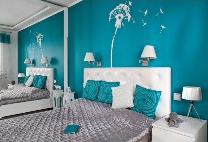 Στο τυρκουάζ δωμάτιο της φωτογραφίας χρησιμοποιήθηκε το λευκό ως δευτερεύον χρώμα αλλά και το γκρι (της κουβέρτας) ως τρίτο. Η κουβέρτα και το καπιτονέ κρεβάτι δίνουν υφή στον χώρο, ενώ υπάρχουν τυρκουάζ και λευκά μαξιλάρια.