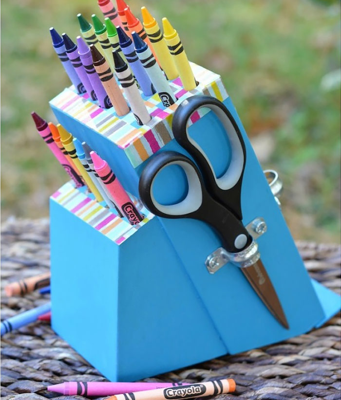 Κάνε όσες τρύπες χωρούν με το αγαπημένο σου τρυπάνι σε μέγεθος λεπτού μαρκαδόρου ή μολυβιού. Βάψε το ξύλο σε ένα έντονο χρώμα και κόλλησε ένα αυτοκόλλητο σαν αυτό που ντύναμε τα τετράδια παλιά, για να μην φαίνονται οι σχισμές που υπήρχαν για τα μαχαίρια. Ύστερα τρύπησε το αυτοκόλλητο που κόλλησες στα σημεία που έχεις κάνει τις τρύπες. Το παιδί σου απέκτησε την πιο kids friendly μολυβοθήκη!