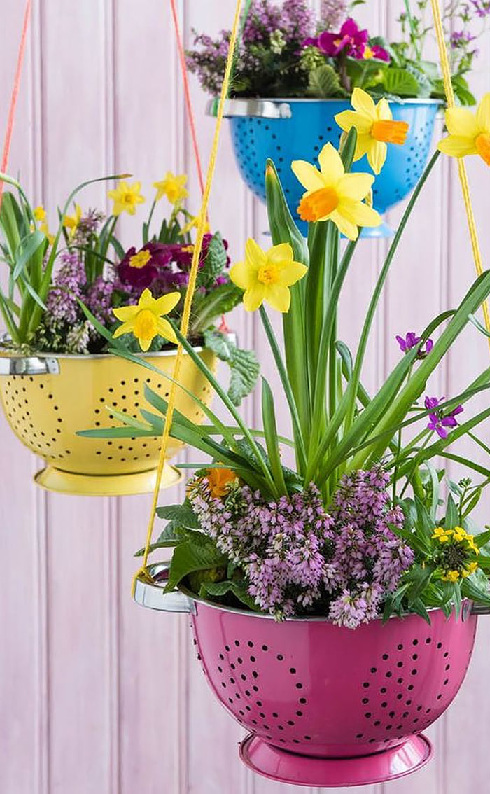 Παίρνεις το σουρωτήρι και το βάφεις σε ένα έντονο καλοκαιρινό χρώμα. Στις λαβές του περνάς τριχιές που ενώνονται σε ένα κρικάκι. Το κρικάκι το στερεώνεις από ένα γαντζάκι στην οροφή. Τοποθέτησε ένα πλαστικό για φυτά που συγκρατεί το νερό. Βάλε ένα φυτό με μικρό ριζικό σύστημα, όπως για παράδειγμα το «σκυλάκι» ή ζήτα κάτι αντίστοιχο. Έφτιαξες την πιο κουλ καλοκαιρινή γλάστρα που έχεις φανταστεί!