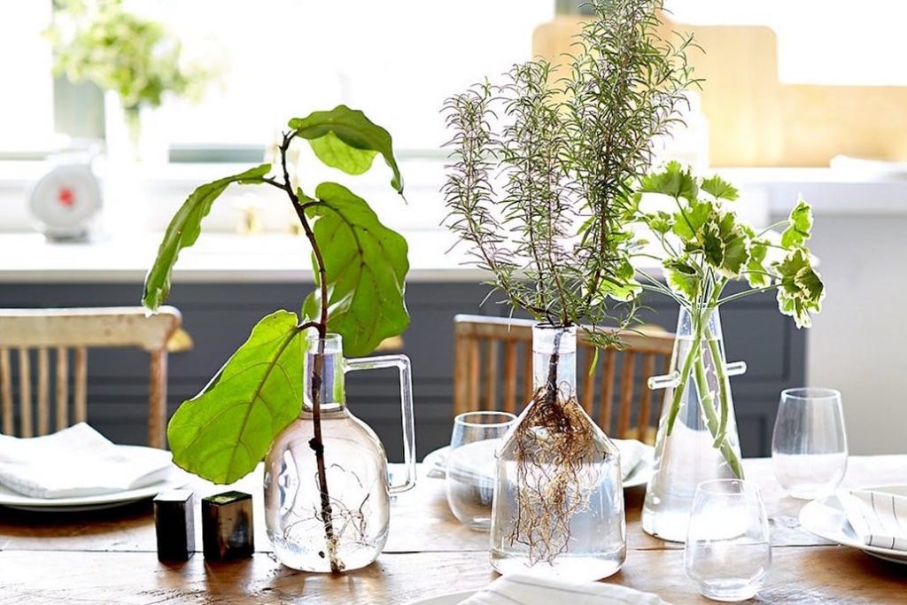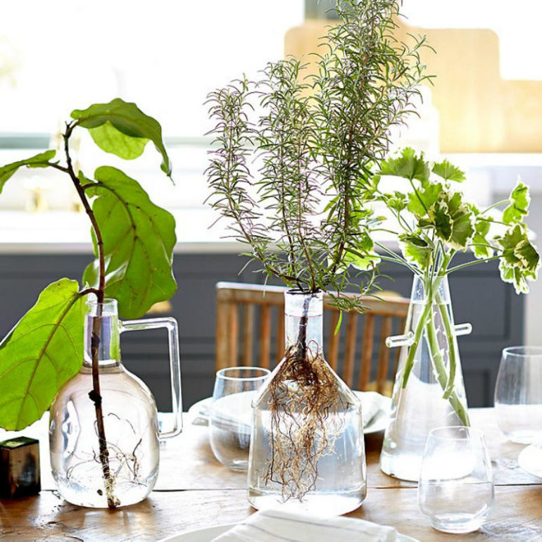 Φίκος λυράτα, δενδρολίβανο και γεράνια σε νερό – χωρίς χώμα, έχουν ριζώσει και είναι τόσο όμορφα που αποτελούν τα κεντρικά κομμάτια στην τραπεζαρία!
