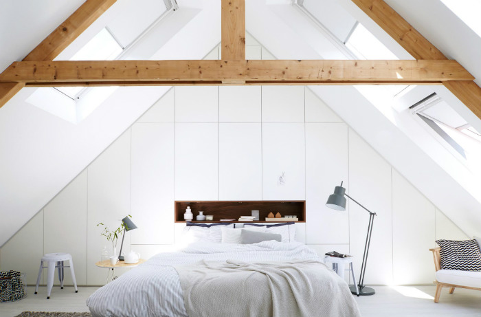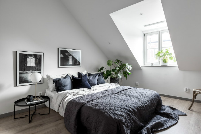Ουδέτεροι τόνοι και ένα μεγάλο κάθετο παράθυρο που χαρίζει φυσικό φως. Το προαναφερθέν κάθετο παράθυρο επιτρέπει την παρουσία φυτών, ενώ οι λεπτομέρειες του δίσκου-κομοδίνου, το γκρι σε μαξιλάρια και κουβέρτα και οι ασπρόμαυρες φωτογραφίες, εξισορροπούν την παρουσία του λευκού. Ιδανικό στήσιμο για ευχάριστο και ήρεμο ύπνο.