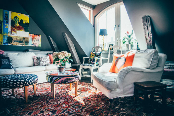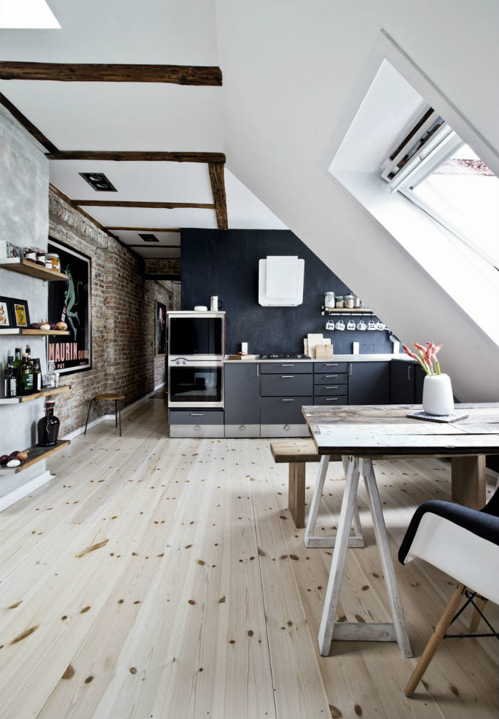 Άλλη μια σοφίτα με μεγάλο κάθετο παράθυρο για μπόλικο φως. Εδώ έχουμε τριπλή χρήση ως σαλόνι, τραπεζαρία και κουζίνα, χωρίς κανέναν απολύτως τοίχο! Η σοφίτα είναι σίγουρα σχεδιασμένη από πολύ ταλαντούχο διακοσμητή εσωτερικών χώρων.
