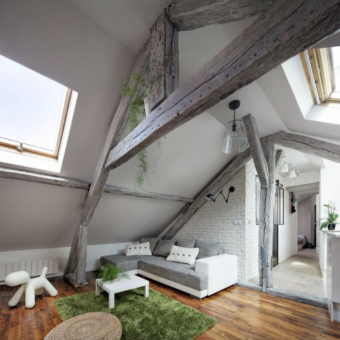 Εδώ και στην κεντρική φωτογραφία του κειμένου, βλέπουμε πως τα δοκάρια έχουν βαφτεί σε γκρι και ταιριάζουν με τα μαξιλάρια του καναπέ. Ο υπόλοιπος τοίχος είναι βαμμένος άσπρος και με άσπρη πέτρα, άσπρο το τραπέζι, το σκυλάκι και ο καναπές! Γενικά τίποτα δεν αφέθηκε στην τύχη, η αντίθεση είναι εξαιρετική και μεγιστοποιείται από την παρουσία του παρκέ! *Έξτρα πόντοι για την πράσινη μοκέτα!