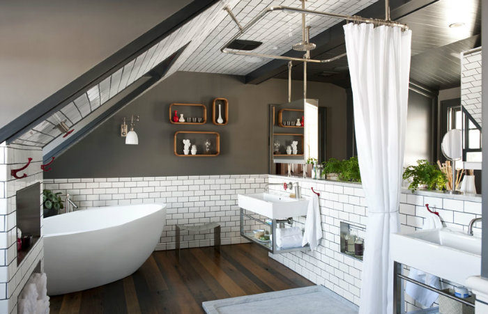 Άλλο ένα πολυτελές μπάνιο, με μπανιέρα και ντους, καθώς και έναν μεγάλο οριζόντιο καθρέπτη. Οι νιπτήρες είναι και εδώ υψηλού design, το πλακάκι τύπου subway είναι ταιριαστό και λατρεμένη επιλογή τα ράφια με στρογγυλεμένες άκρες στο χρώμα του χαλκού.