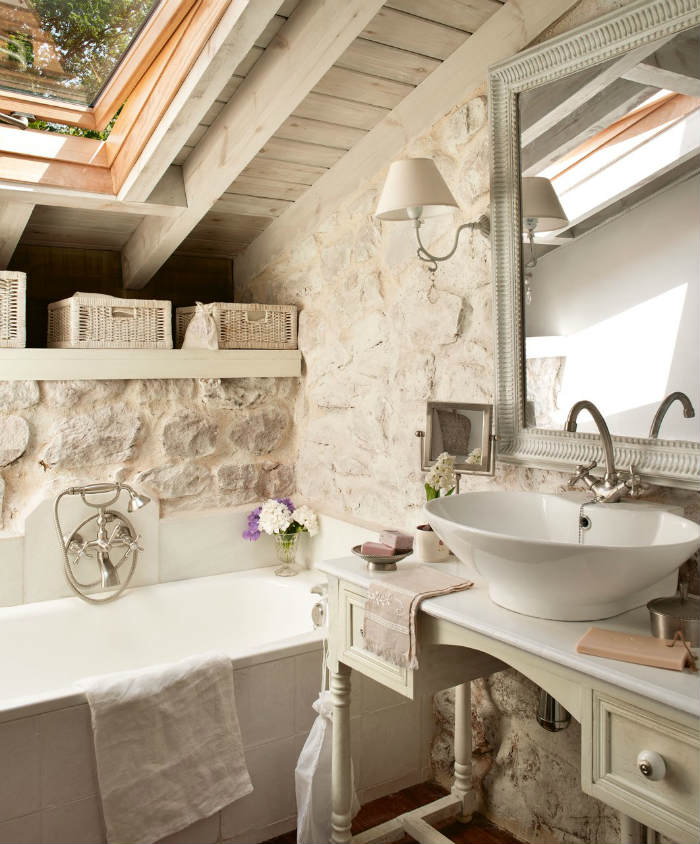 Ρομαντικό vintage μπάνιο, όπου έχουμε άλλο ένα πάρτι μικρών λεπτομερειών: ο νιπτήρας και το έπιπλό του, τα λουλούδια στο βάζο και το ναρκισσάκι (με τον βολβό, δεν είναι κομμένο) δίπλα στον νιπτήρα, το φως, ο ξύλινος φεγγίτης που «σπάει» το shabby look και ο καθρέπτης. Μετά έχουμε ταυτόχρονη χρήση ξύλου, πλακακιού μπάνιου και backsplash (πίσω από την μπαταρία), μαζί με χτιστή πέτρα σε μόλις 6-8 μ²!