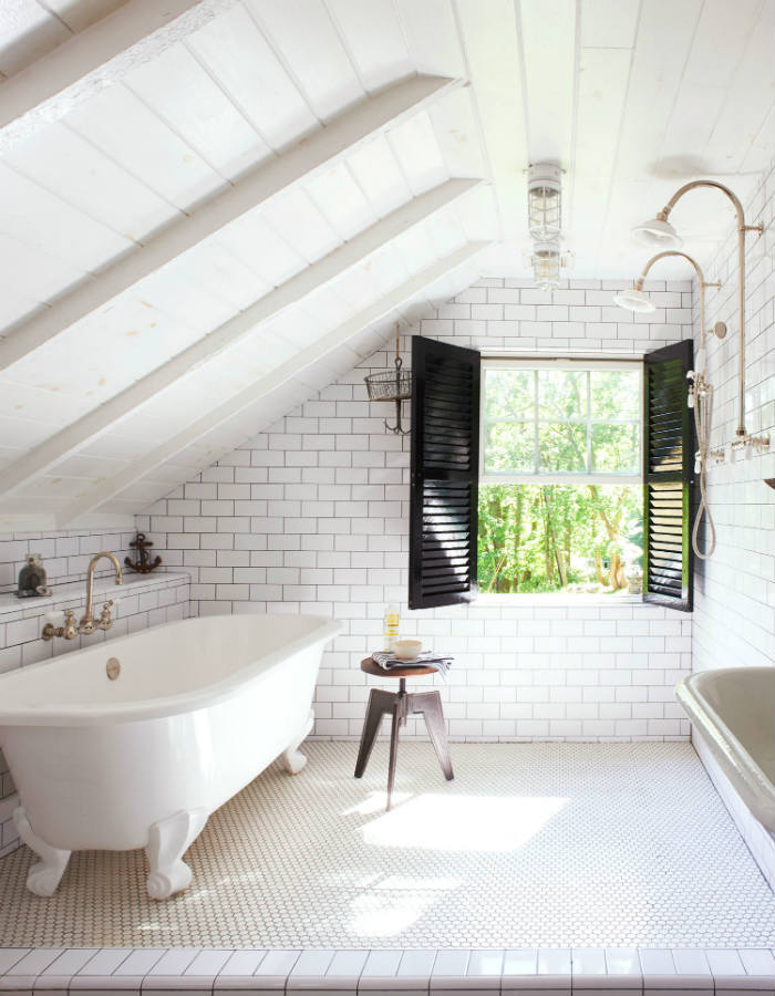 Σε ένα λευκό χώρο όπως εδώ, το αντιγλιστρικό πατάκι-κηρύθρα, το παντζούρι και το σκαμπό δίνουν όσο χρώμα χρειάζεται να σπάσει η μονοτονία. Βλέπουμε όμορφες λεπτομέρειες στα φώτα, στην μπαταρία του μπάνιου και στην διακοσμητική άγκυρα, όσο και στην θέα έξω.