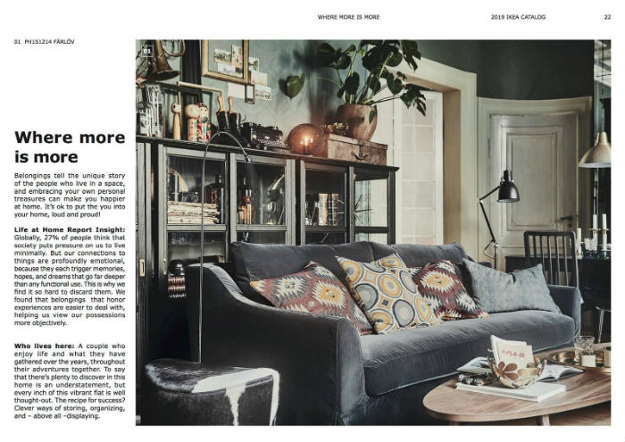 Δεν θα λέγαμε πως ο κατάλογος ΙΚΕΑ 2019 είναι πλήρως μαξιμαλιστικός (όπως στο σχετικό άρθρο), αλλά σίγουρα υποδηλώνει μια τάση διακόσμησης που απέχει απο τους απλουστευμένους και μινιμαλιστικούς χώρους που μας είχε συνηθίσει. Τα δωμάτια έχουν μια αίσθηση πλούσιου χρώματος, επίπλων,τέχνης και πολλών άλλων, με τρόπους που τα κάνουν πολύ ζωντανά – σχεδόν ζωηρά, σε αντίθεση με την ηρεμία του μινιμαλισμού!
