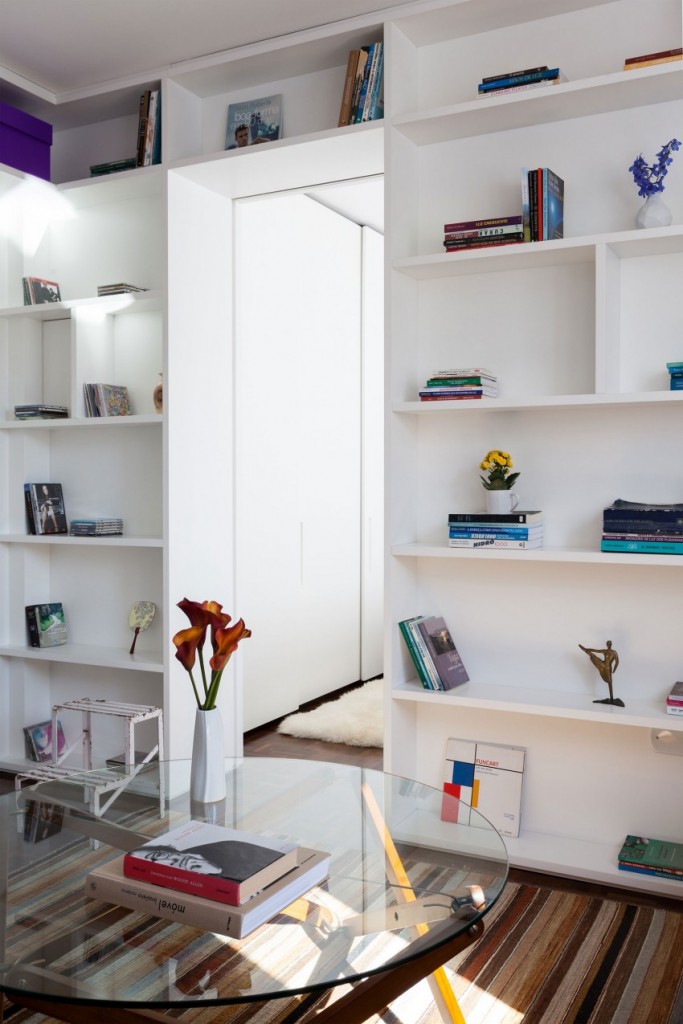 Ένας καθρέπτης στο χρώμα του κεχριμπαριού δημιουργεί μια αίσθηση ευρυχωρίας, η οποία τονίζεται από το ριγέ χαλί και τον καναπέ χωρίς μπράτσα που σχεδιάστηκε από τον αρχιτέκτονα. Η μια από τις πλευρές του καναπέ, εφάπτεται σε μια μεγάλη λευκή βιβλιοθήκη. Η βιβλιοθήκη καταλαμβάνει μεγάλο μέρος του τοίχου του διαμερίσματος και κρύβει την πρόσβαση στο υπνοδωμάτιο μέσω μιας συρόμενης πόρτας!