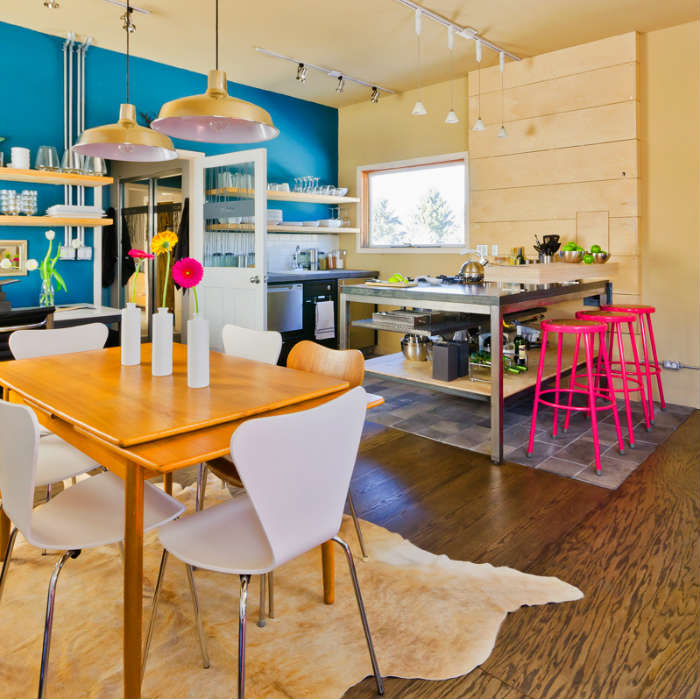 Στην κεντρική φωτογραφία του άρθρου βλέπουμε τον λαμπερό μπλε τοίχο, σε συνδυασμό με inox πάγκο εργασίας και φωσφοριζέ νέον φούξια σκαμπό που δίνουν ιδιαίτερο στυλ στην κουζίνα. Τα χρυσά φωτιστικά στην τραπεζαρία, ταιριάζουν με το χαλί της και τον τοίχο στα δεξιά στην φωτογραφία.