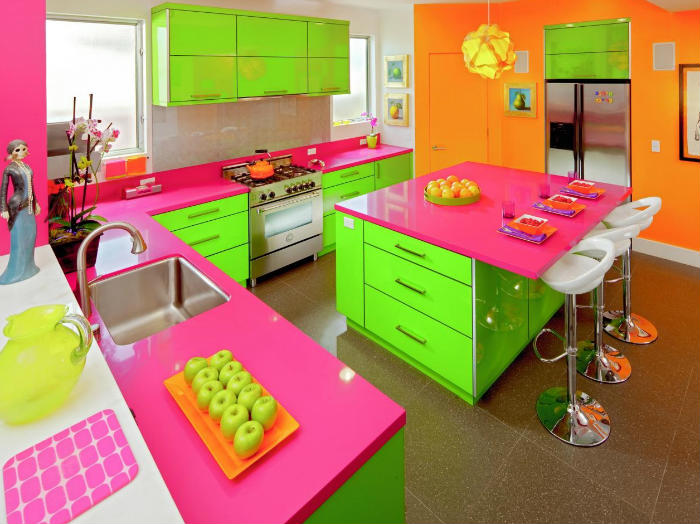 Για το τέλος αφήσαμε το πιο τολμηρό απ’ όλα. Το πιο πιθανό είναι να αποτελούσε στοίχημα μεταξύ διακοσμητών: «Μπορείς να κάνεις κουζίνα με φωσφοριζέ λαχανί και φωσφοριζέ ροζ ως κύρια χρώματα, με πορτοκαλί, ροζ και άσπρο τοίχο;» Κάποιος το δέχτηκε λοιπόν το στοίχημα και το αποτέλεσμα ακόμα και αν δεν είναι του στυλ σας ή του στυλ μας, ακόμα και αν κουράζει τα μάτια μετά από ώρα, είναι ότι γίνεται.