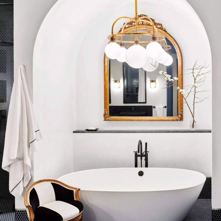 Ένας μοντέρνος πολυέλαιος τύπου sputnik μεταμορφώνει το λευκό και χρυσό μπάνιο σε έναν πολύ ζωντανό χώρο. Τονίζει την μπανιέρα με πόδια λιονταριού και δίνει εξαιρετικό ύφος χάρη στην χρυσή μπαταρία με την οποία ταιριάζουν. Υπερπολυτελής και ταυτόχρονα απλός χώρος, ακόμα και χωρίς τα μαρμάρινα πλακάκια!