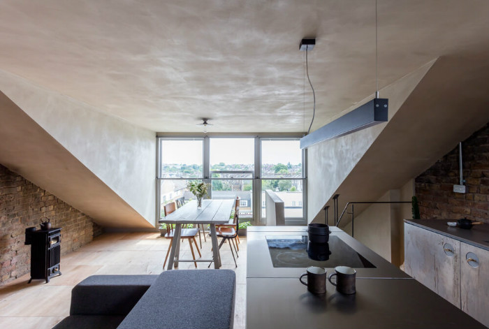 Την θέρμανση για πριν και μετά το μπάνιο την «έχουν αναλάβει» παραδοσιακά θερμαντικά σώματα της Βικτωριανής εποχής σε μαύρο ματ, τα οποία δείχνουν πανέμορφα.Η τουαλέτα βρίσκεται ξεχωριστά από την «ζώνη μπάνιου» (ο αρχιτέκτονας χρησιμοποιεί επί λέξει τον όρο bathing zone), σε ένα μικρό δωμάτιο ανάμεσα στις δύο κρεβατοκάμαρες του διαμερίσματος.