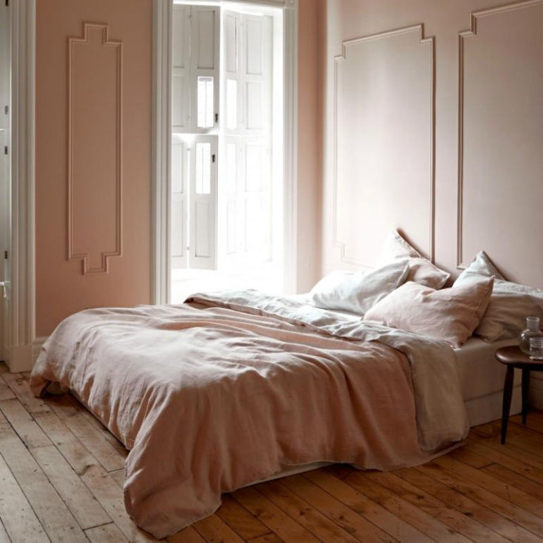 Μια αρχιτέκτονας στο Brooklyn έντυσε τον ξενώνα σε αποχρώσεις ανάμεσα στο σομόν και το ροζ, με αντίστοιχα σκεπάσματα. Συμπλήρωσε με λευκό και με παρκέ από πεύκο, σε λίγο πιο σκούρο χρώμα που ταιριάζει απόλυτα με την υπόλοιπη παλέτα. Το κομοδίνο-σκαμπώ, προτιμήθηκε σε πιο σκούρο ξύλο για αντίθεση.