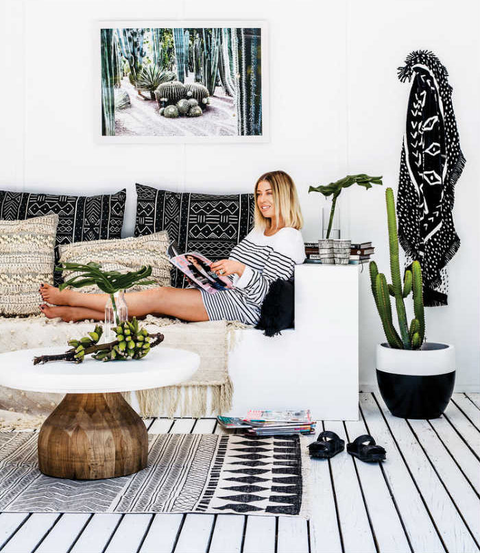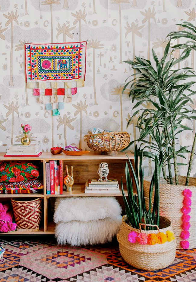 Boho με πολλά διαφορετικά μοτίβα και χρώματα. Πανέμορφο κρίνεται το πάντρεμα της ταπετσαρίας με τα φοινικοειδή φυτά (μοιάζουν με είδος γιούκα, αλλά δεν παίρνουμε όρκο). Φυσικά η ψάθα είναι κάτι περισσότερο από ταιριαστή.