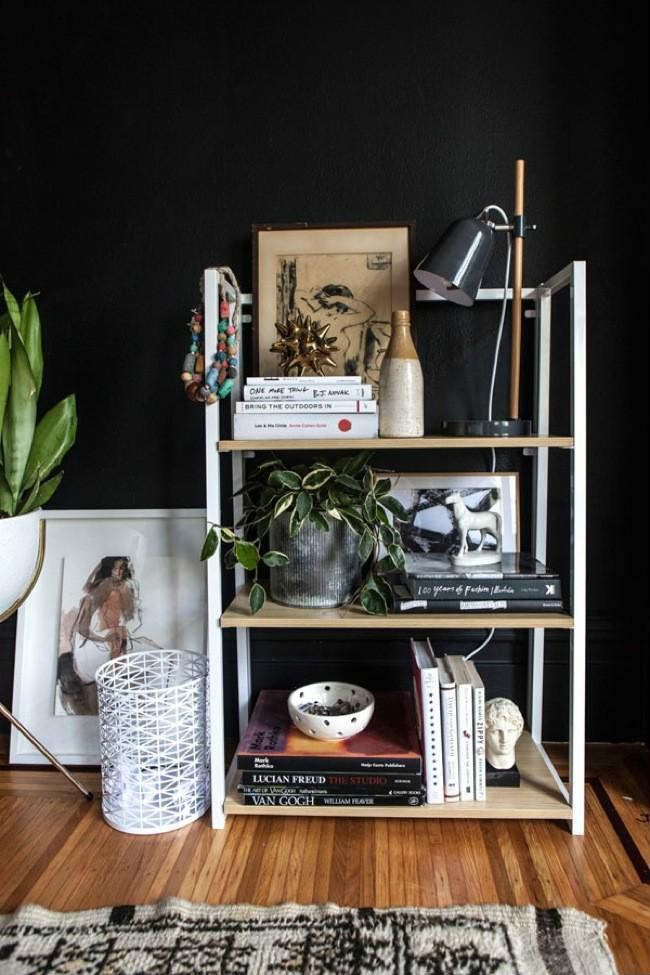 Πολλή τέχνη και πολλή διακόσμηση. Ο μαύρος τοίχος έδωσε το περιθώριο να τοποθετήσει πολλά πράγματα, σε μικρό χώρο, με όμορφο τρόπο.