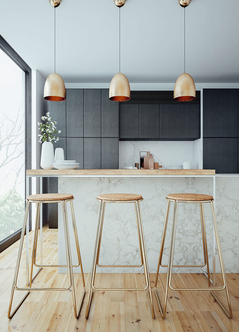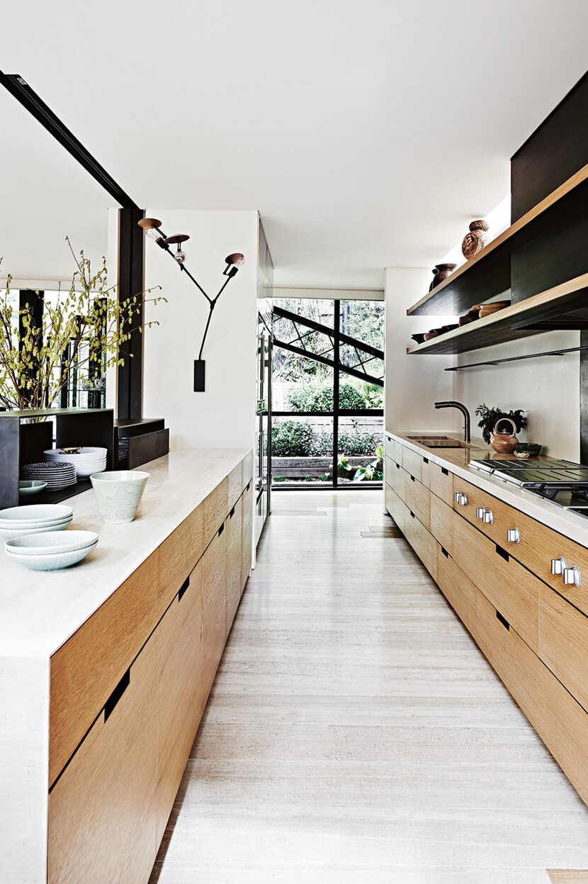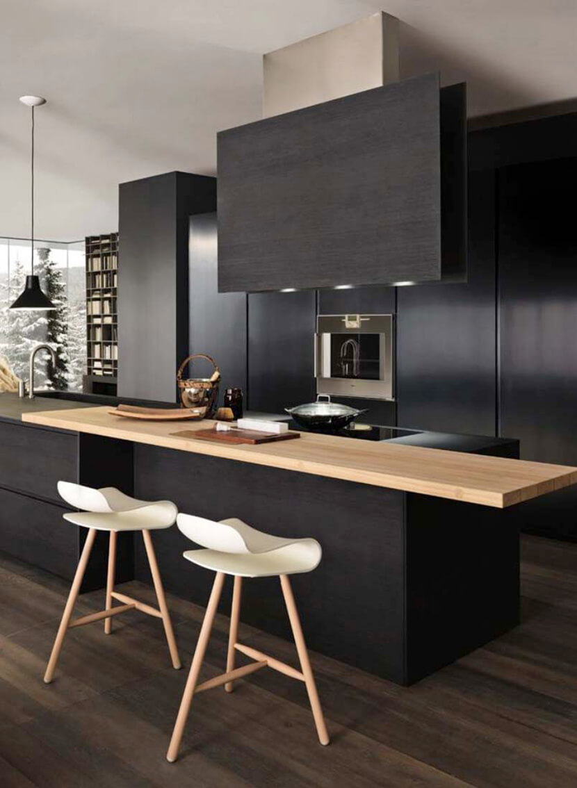 Καλό είναι να μην θεωρούμε υποχρεωτικό το ανοιχτό χρώμα ξύλου στον Γιαπωνέζικο Μινιμαλισμό. Κάθε είδος ξύλου είναι ευπρόσδεκτο, όσο σκούρο και να είναι. Για παράδειγμα η παρακάτω κουζίνα με μαύρες και ανθρακί λεπτομέρειες υποστηρίζεται από τον πάγκο με το ανοιχτόχρωμο ξύλο και τα σκαμπό, ενώ το παρκέ είναι σκούρο. Ένα μέρος της αρμονίας οφείλεται στο γεγονός ότι το ανοιχτόχρωμο ξύλο τοποθετήθηκε στο κέντρο, κολακεύοντας την κουζίνα μέσω της αντίθεσης!