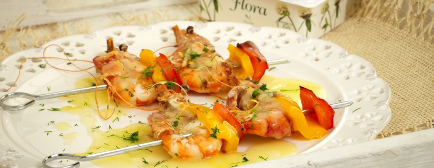 Γαρίδες σουβλάκι με σάλτσα βουτύρου και λεμονιού