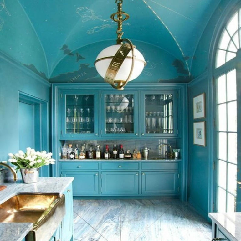 Το τυρκουάζ άρεσε, οπότε όλη η κουζίνα περικυκλώθηκε από αυτή την απόχρωση. Το μάρμαρο στους πάγκους και το πάτωμα είναι πανέμορφο και μαζί με τον νιπτήρα αριστερά και την βιτρίνα μπαρ δίνουν ένα άκρως πολυτελές αποτέλεσμα. Το ταβάνι περιλαμβάνει ένα αγαπημένο εκλεκτικό μοτίβο, τον χάρτη, που ταιριάζει απόλυτα με το εκλεκτικό φωτιστικό.