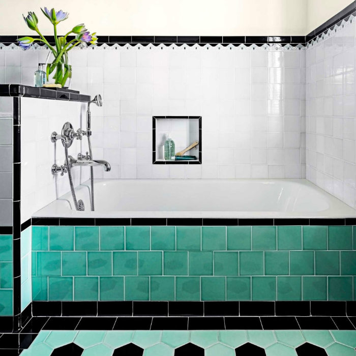 Εδώ, η σχεδιάστρια Elizabeth Roberts επέλεξε μικρό εξάγωνο πλακάκι σε στυλ vintage για το πάτωμα και (περίπου) τετράγωνα πλακάκια στο χρώμα της μέντας και μαύρα που το οριοθετούν.