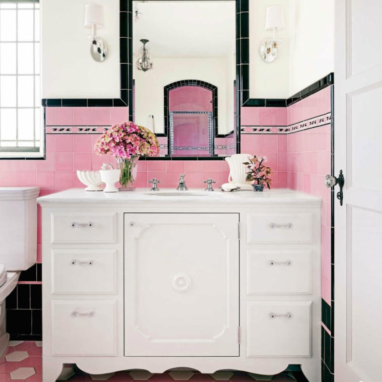 Τα μαύρα εξάγωνα πλακάκια στο πάτωμα δίνουν ένα πρωτότυπο…πουά μοτίβο (όπως στην τέταρτη μας φωτογραφία).Εκτός από τα ρετρό μπουκάλια και το φωτιστικό, εντυπωσιάζει το πλαίσιο του καθρέπτη. Πρόκειται για ένα μπάνιο με την σωστή δόση…δράματος, χάρη στο μαύρο.